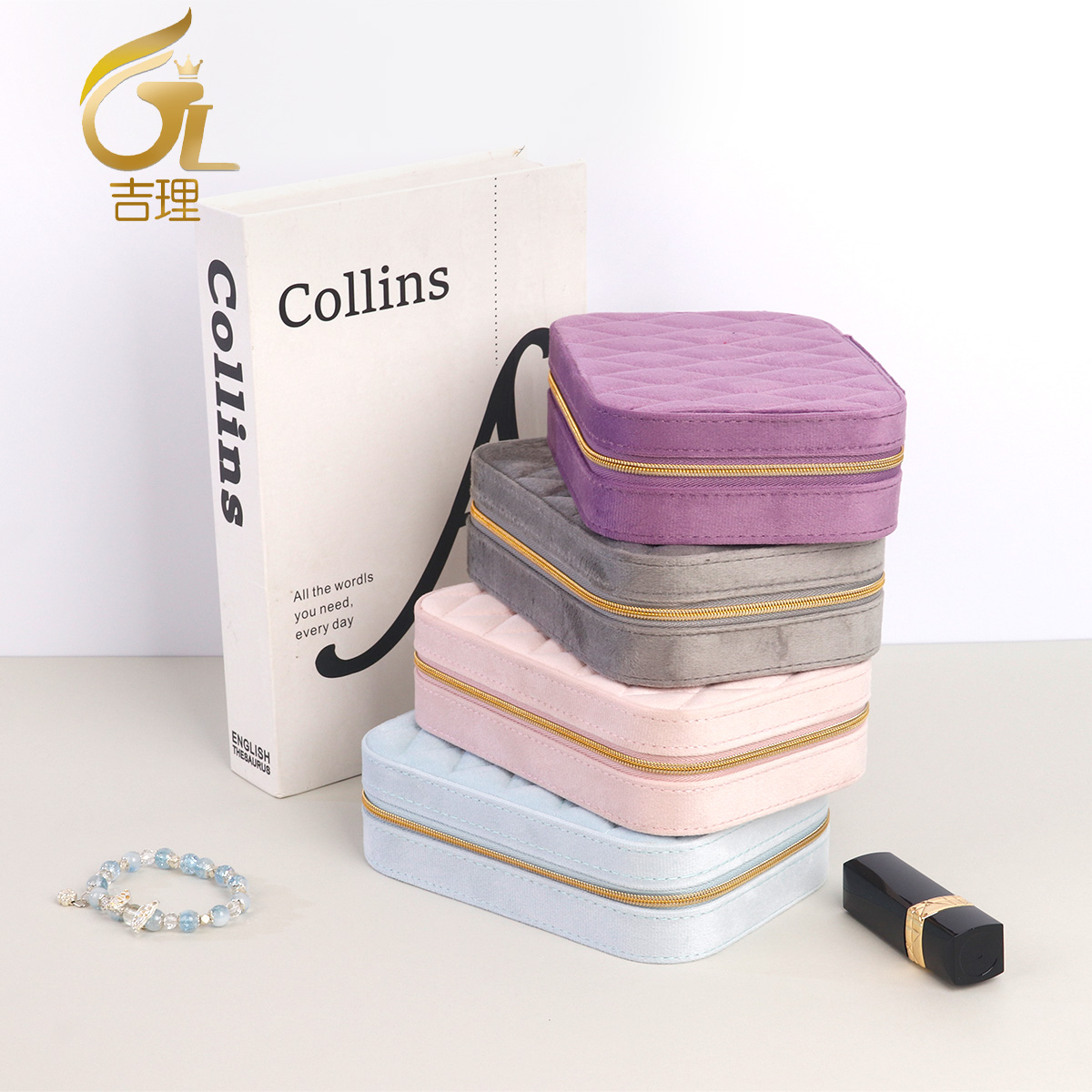 丝绒菱格长方拉链盒16X11X5