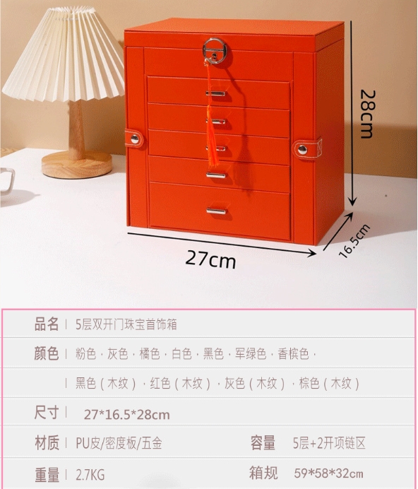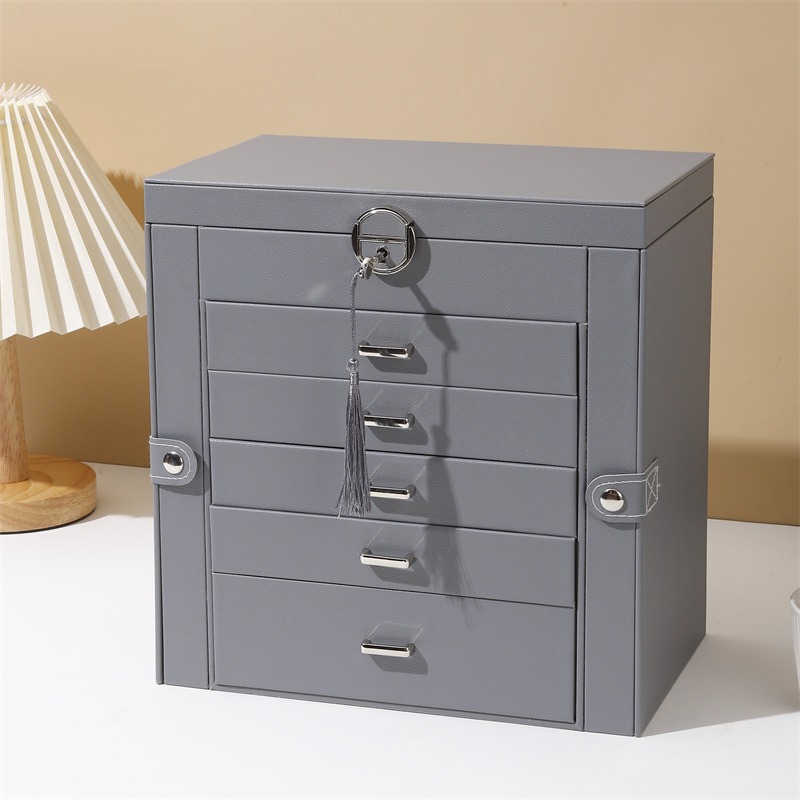 灰色五层抽屉双侧开皮革首饰盒 圆锁扣