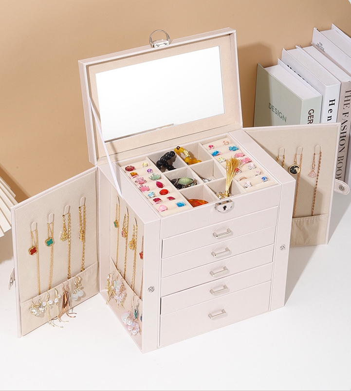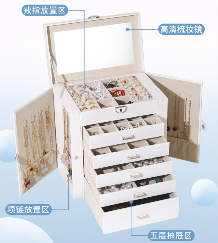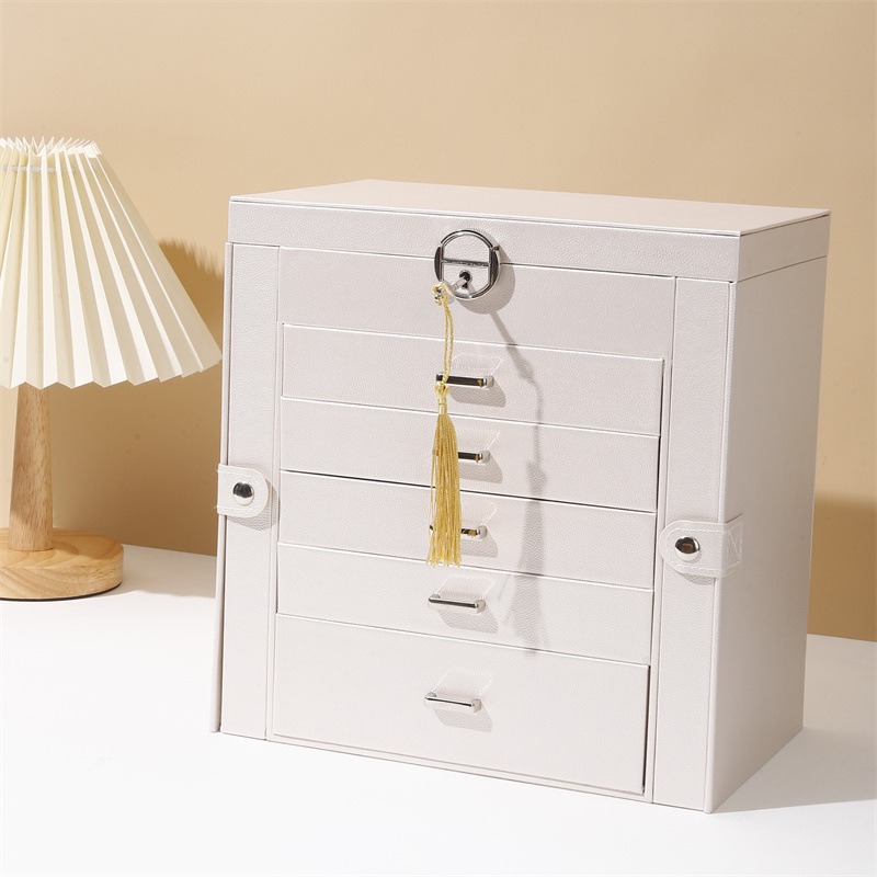 香槟色五层抽屉双侧开皮革首饰盒 圆锁扣