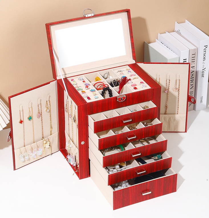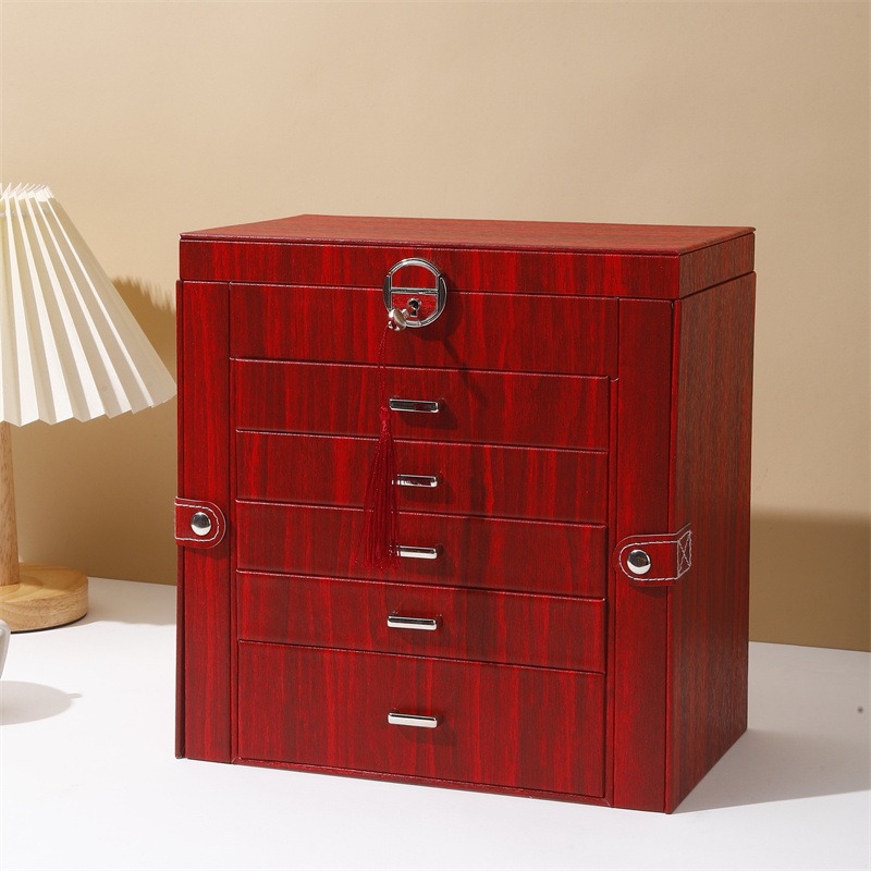 树纹红色五层抽屉双侧开皮革首饰盒 圆锁扣